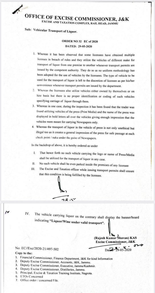 In a significant development, Excise Commissioner Union Territory of Jammu and Kashmir Rajesh Kumar Shavan on Friday issued order for regulation in transportation of liquor from one place to other and term the “Transportation of liquor in vehicles carrying Press Logo as unethical” shaming the Nobel profession.