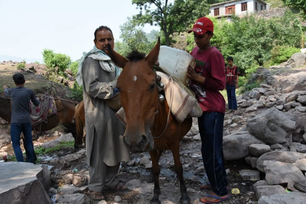 “We trek five kilometers twice everyday just to collect water for our households,” says an exhausted Janghir Hussain pointing to the many plastic and aluminum barrels that are in the process of being filled up and loaded on to the horses. “What can I say about our woes, what with the Corona scare and the shelling from across the border, our lives are miserable,”he says wiping the sweat from his brow, tired from undertaking the trek in an arduous terrain. Everyday men and children from the village of Daryrian in Sagara Panchayat in Mankot Tehsil of Poonch in Jammu and Kashmir spend five to six hours collecting water for the daily needs of their families. This frontier village, situated on the line of Control between India and Pakistan faces a severe water stress. Home to the Bakarwal tribe, a nomad community which migrates with their horses seasonally to the lower plains, the region has no source of water for either its people or its horses which is their primary source of livelihood. Twice a day, the community collects water from a natural spring that runs in a village down the plains. They then trudge up the hilly terrain along with their horses carrying back loads of water, uncertain if the water is even potable.