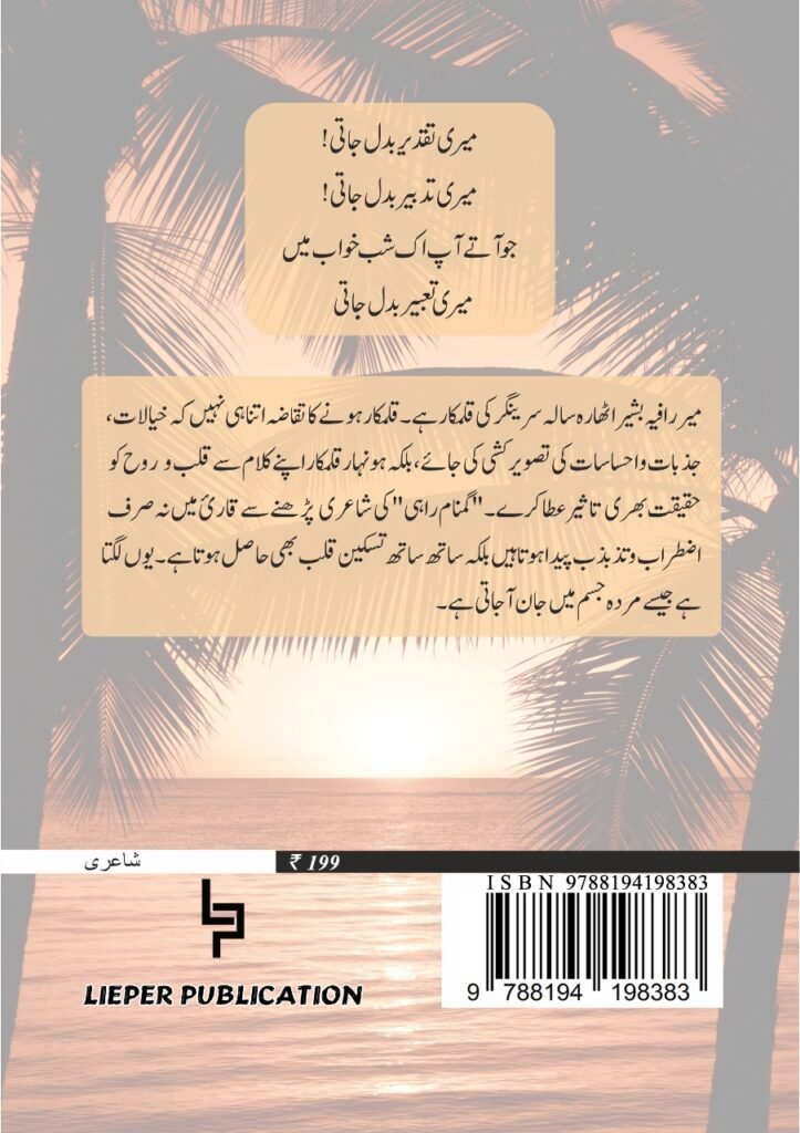 Mir Raafiyah Bashir, a female 12th class student, has been into the field of Urdu writing since last four years. She has written several articles and poems, after finally succeeding to come up with a complete book in order to give her competence and thoughts a dignified shape.