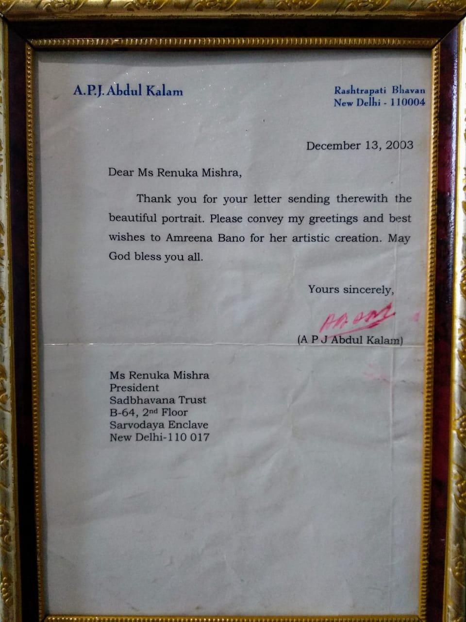 Amrina Naik has a knack for Arabic calligraphy, calligraphy, painting, fashion designing, and interior decoration. She is also master in the art of painting. A few years ago, she drew a sketch of the late former president of the India, Dr.APJ Abdul Kalam, which the late president liked very much and sent her a letter of appreciation in response. Amrina Naik has also produced the best portraits of the poet Allama Iqbal.