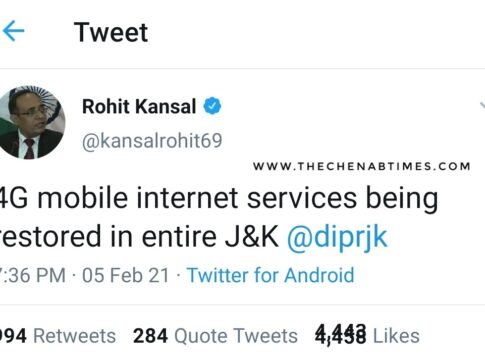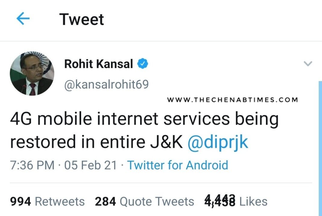 The government spokesman, Rohit Kansal in a tweet informed that 4g mobile internet services are being restored in J&K.