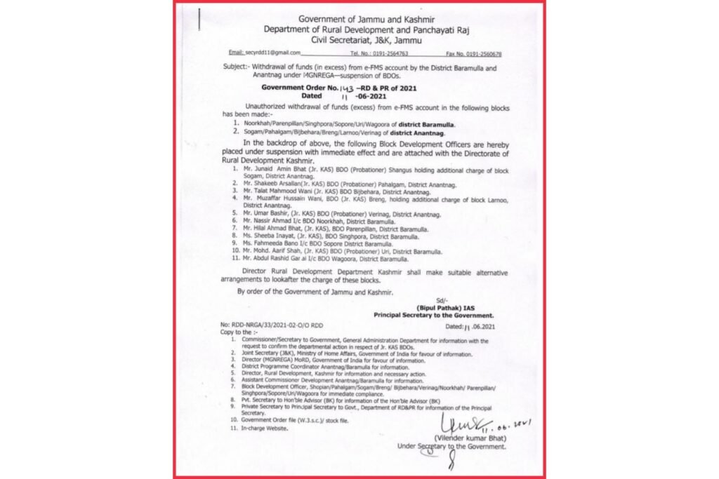 Two Assistant Commissioners of Development (ACDs) and 12 Block Development Officers (BDOs) in Kashmir Valley on Friday.ACDs in north Kashmir’s Baramulla district and south Kashmir’s Anantnag district have been placed under suspension for unauthorised withdrawal of funds (excess) from e-FMS account, according to separate orders issued by Principal Secretary to the Government, Rural Development Department, Bipul Pathak.District Anantnag has withdrawn Rs. nine lakh from the Common account (eFMS, Material & Wages) unauthorizedly, according to an order dated 11-06-2021 under number 145 – RD&PR of 2021.It further indicates that after requesting clarification from ACD, he claimed that BDO Pahalgam, BDO Sogam, BDO Breng, BDO Bijbehara, BDO Larnoo, and BDO Verinag had made excessive payments and breached the terms of payment release.However, he has not revealed the names of the concerned BDOs, according to the report, which also stated that the district of Anantnag is regularly withdrawing extra funds unauthorizedly, with Rs 15 lakh being withdrawn as of today.“In light of the foregoing, Mr. Nisar Ahmad Malik, KAS, ACD Anantnag has failed to perform his duties in preventing his BDOs from making unauthorised withdrawals. As a result, Mr. Nisar Ahmad Malik, KAS, ACD Anantnag is hereby suspended with immediate effect and shall remain attached to the Directorate of Rural Development Kashmir. Mr. Ideel Saleem, KAS, Assistant Commissioner Panchayat, Anantnag, in addition to his own duties, would be in charge of ACD Anantnag until further orders,” the order stated.Perusal of NREGA Soft on 08-04-2021 found that District Baramulla had withdrawn an amount of Rs. 1.91 crores from Common account MNREGA (eFMS, Material & Wages) unauthorizedly, according to a separate order.It goes on to say that the ACD has failed to provide a proper justification and has failed to disclose block-by-block and GP-by-GP data revealing the blocks withdrawing extra amounts versus the funds released. According to the ruling, the district is withdrawing funds unauthorizedly on a regular basis, with a total of Rs 2.04 crores withdrawn to date.“In light of the foregoing, ACD Baramulla has failed to discharge his duties in preventing his BDOs from making unlawful withdrawals, hence Mr. Yaar Ali Khan (KAS), ACD Baramulla is now suspended with immediate effect and shall stay attached to the Directorate of Rural Development Kashmir. “Until further orders, Mr. Gulzar Ahmad KAS, Assistant Commissioner Panchayat, Baramulla, shall undertake the responsibility of ACD Baramulla in addition to his own duties,” the ruling stated.Meanwhile, the government has suspended 11 BDOs in Noorkhah, Parenpillan, Singhpora, Sopore, Uri, Wagoora of district Baramulla and Sogam, Pahalgam, Bijbehara, Breng, Larnoo, Verinag blocks of district Anantnag for unauthorised withdrawal of cash (extra) from e-FMS account.The Block Development Officers are hereby placed under suspension with immediate effect and are attached with the Directorate of Rural Development Kashmir, the order reads.Junaid Amin Bhat (Jr. KAS) BDO (Probationer) Shangus, having additional charge of block Sogam, District Anantnag, Shakeeb Arsallan (Ir. KAS) BDO (Probationer) Pahalgam, District Anantnag, Talat Mahmood Wani (Ur. KAS) BDO Bijbehara, District Anantnag, Muzaffar Hussain Wani, BDO (J BDO (Probationer) Verinag, District Anantnag, Umar Bashir (Ir. KAS) Hilal Ahmad Bhat, (Jr. KAS), BDO Parenpillan, District Baramulla, Nassir Ahmad I/C BDO Noorkhah, District Baramulla, Nassir Ahmad I/C BDO Noorkhah, District Baramulla, Nassir Ahmad I/C BDO Noorkhah, District Baramulla, Nassir Ahmad I/C BDO Noorkhah, Sheeba Inayat (Jr. KAS), BDO Singhpora, District Baramulla, Fahmeeda Bano I/C BDO Sopore, District Baramulla, Mohd. Aarif Shah (Dr. KAS), BDO (Probationer) Uri, District Baramulla, and Abdul Rashid Gar al 1/c BDO Wagoora, District BaramullaThe Director of the Department of Rural Development in Kashmir has been requested to establish alternative arrangements for the charge of these blocks.The government has also announced the suspension of BDO Shopian Muzaffar Ahmad Sheikh in a separate order. He has been assigned to the Kashmir Directorate of Rural Development Department.