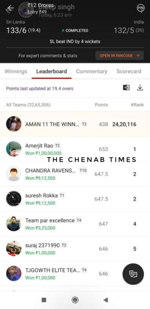 In the match between India and Sri Lanka, Amerjeet Kumar Rao from Village Joura Kalan, Tehsil Kahara, District Doda, J&K won one crore in Dream11.
