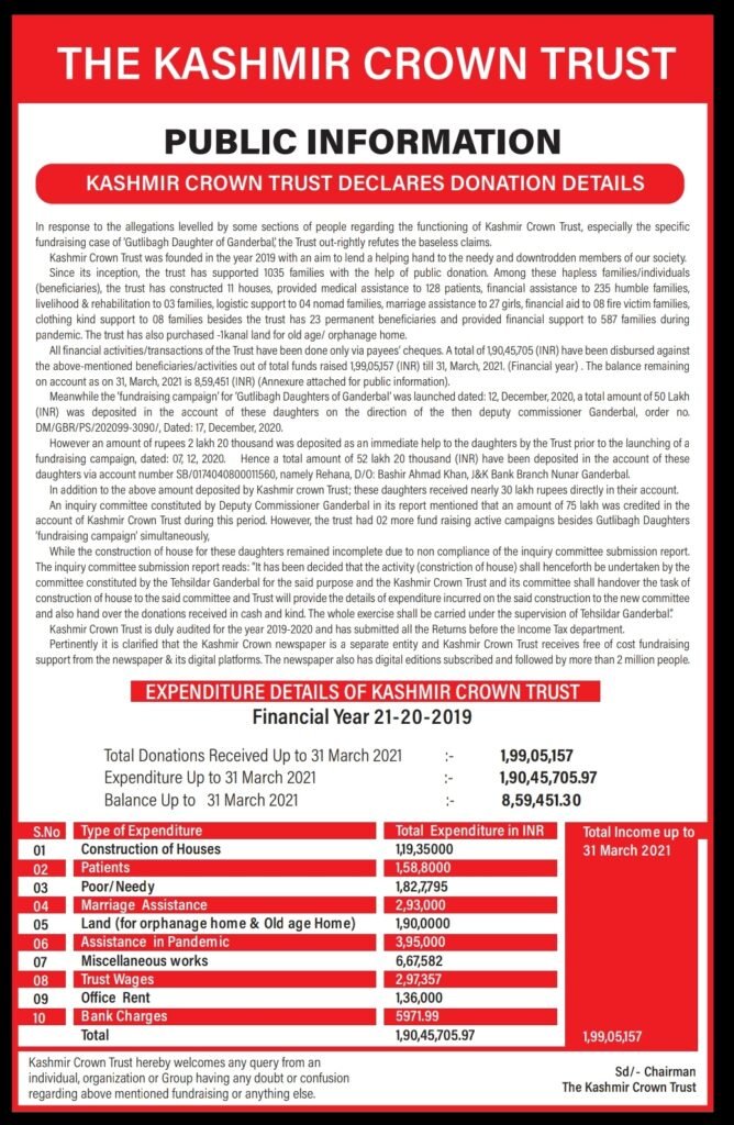 Pertinently, it is clarified that the Kashmir Crown newspaper is a separate entity and Kashmir Crown Trust receives free of cost fundraising support from the newspaper & its digital platforms. The newspaper also has digital editions subscribed and followed by more than 2 million people.