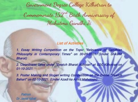 Gandhi Jayanti is an event celebrated in India to mark the birthday of Mahatma Gandhi Ji. It is celebrated annually on 2nd October, and is one of the three national holidays of India. October 2nd is also, globally observed as an International Day of Non-Violence. To commemorate Gandhi Jayanti Govt Degree College, Kilhotran under the supervision of Principal Dr Javid Iqbal has planned to organize a series of events. To begin with the College today organized an online essay writing competition on the theme of “Relevance of Gandhian Philosophy of Ahimsa in Contemporary Times”. In the event students highlighted the relevance of Gandhian Philosophy in contemporary times and stressed how Gandhi Ji’s philosophy of Ahimsa is still an important non-violent tool in Modern Democracies. In the event Azhar Khan got the First Position while Waseem Ahmed and Saima Saleem secured 2nd and 3rd position respectively. Principal Dr Javid Iqbal appreciated all the participants and urged them to participate in the other events viz Cleanliness drive, Poster Making and Slogan writing Competition. The events will culminate on 2nd of October with the prize distribution ceremony.
