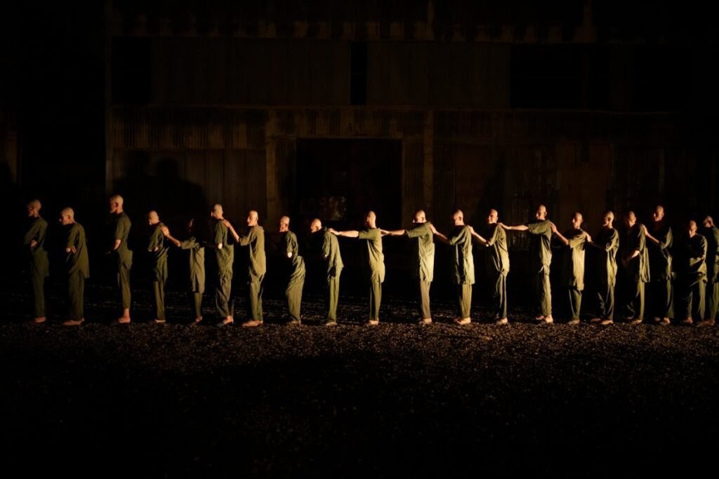 The males are undressed down to their underwear and showered. They have shaven heads.