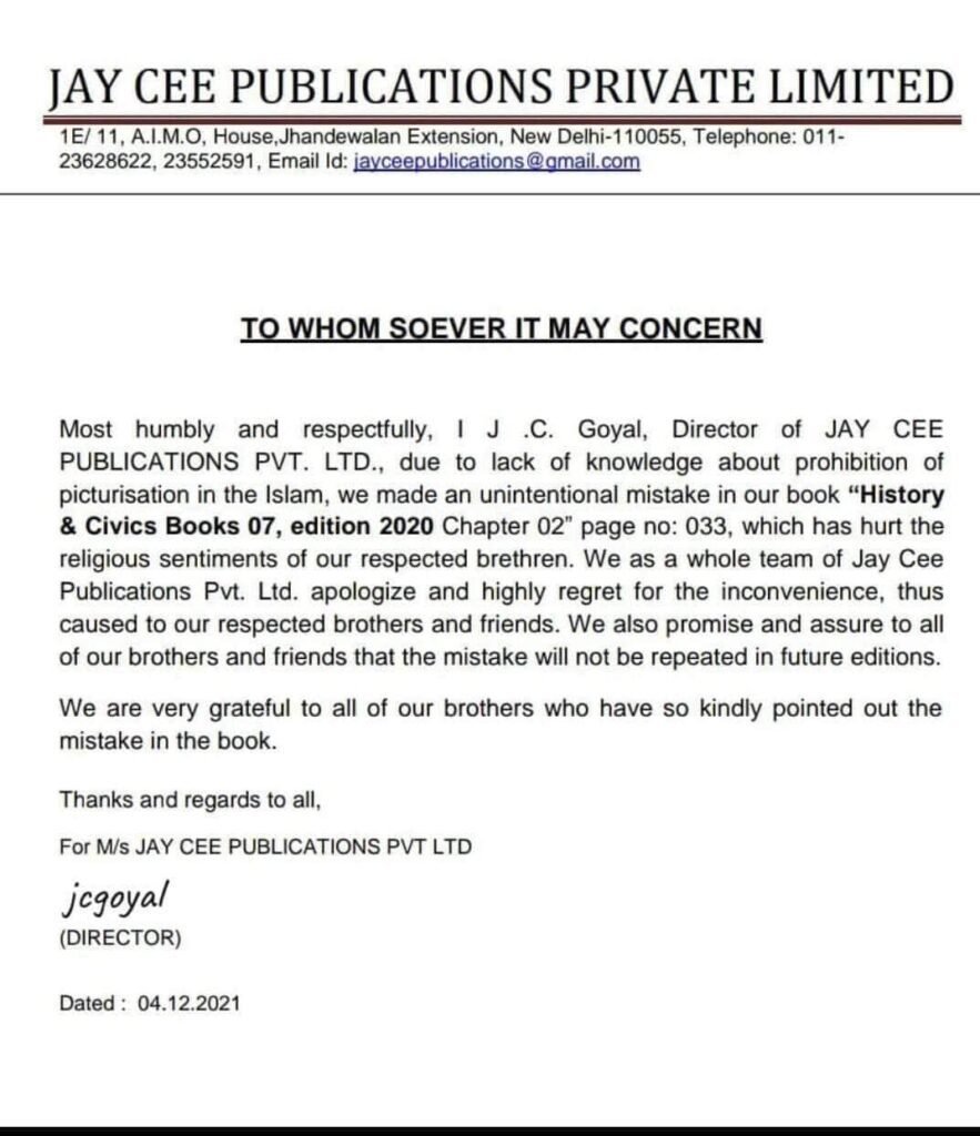 The Director of publication house JC Goyal in a handout said “Most humbly and respectfully, I J.C Goyal, Director of JAY CEE PUBLICATIONS PVT. LTD., due to lack of knowledge about prohibition of picturisation in the Islam, we made an unintentional mistake in our book “History & Civics Book 7, edition 2020, Chapter 02, page number 033, which has hurt the religious sentiments of our respected brethren.”