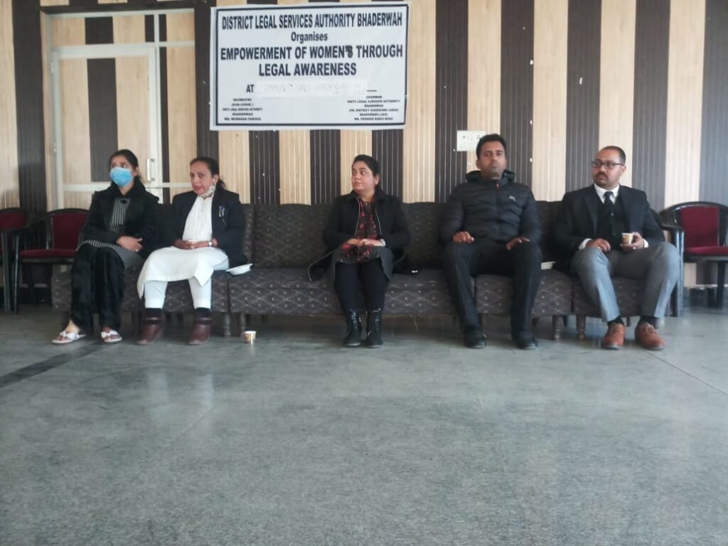 District Legal Services Authority Bhaderwah , today organised a Legal Awareness Program on “the Empowerment of Women” at Community hall Bhaderwah here today under the guidance and Supervision of Chairman DLSA and Secretary DLSA Bhaderwah Mudassir Farooq . Sub Judge Bhaderwah Sumiti Sharma was also present on the occasion who threw light on various special laws for women in India . During the awareness program Legal Rights available to women under different Statues were discussed at length with the participants by the resource persons which included Advocate Manju Sharma , Advocate Vabhu Sharma , Advocate Devyia Kotwal and Advocate Mohd Majid Malik.