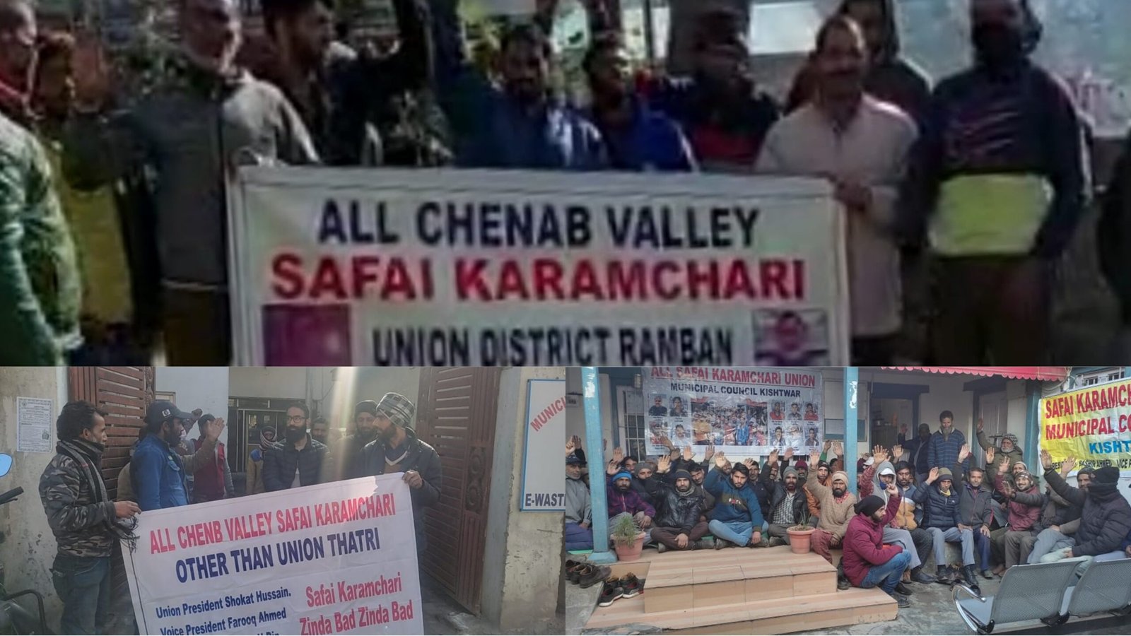 After warning a week ago, Safaikaramcharis and other casual/daily basis labourers from seven municipalities including Banihal, Ramban, Batote, Doda, Bhaderwah, Thathri and Kishtwar of Jammu province went on indefinite “Kaam Choro Strike” on Tuesday.