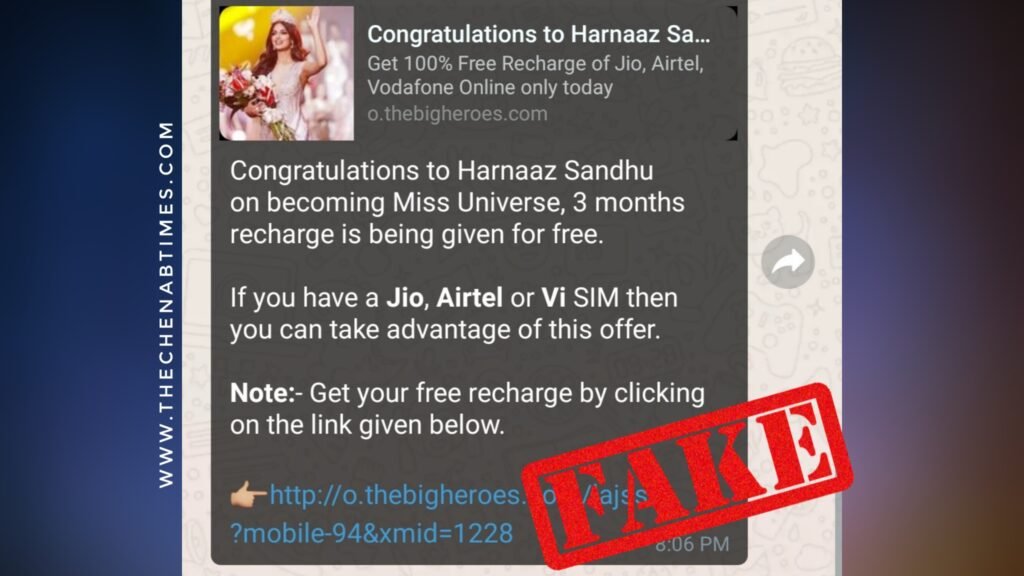 Well, today’s article is about a viral message on social media, especially WhatsApp, which offers you a free recharge for 3 months on the win of Harnaaz Sandhu as Miss Universe 2021.