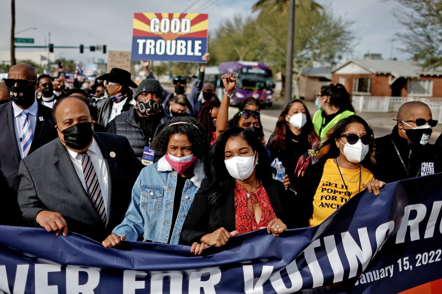 Martin Luther King III; his wife, Arndrea Waters King; and their daughter Yolanda Renee King, 13, took part Saturday in an on-the-ground campaign for voting rights in Phoenix. They marched with local activists and supporters from Pilgrim Rest Baptist Church, a predominantly Black church, and speak about the importance of “no celebration without legislation.”