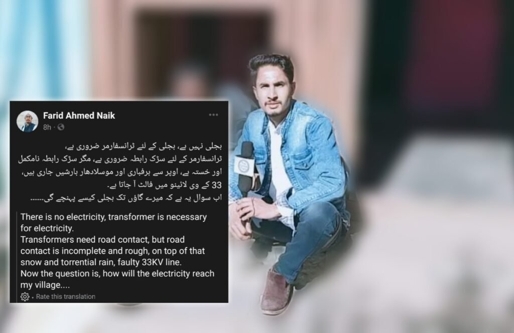 In a Facebook post in the Urdu language, Naik said, “There is no electricity, transformer is necessary for electricity [here], [While] Road connection is required for transformer, but road connection is incomplete and dilapidated, snow and heavy rains continue from above, fault occurs in 33 kV line. Now the question is how the electricity will reach my village.”