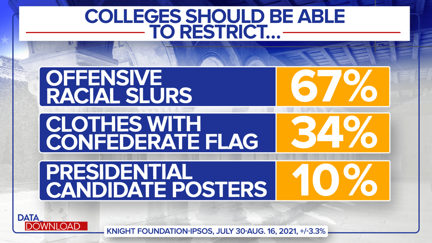 On that checklist of different potentialities: 34 % assist restrictions on sporting clothes with the accomplice flag, 19 % favor restrictions on expressing political beliefs which might be upsetting or offensive to sure teams and 10 % favor restrictions on displaying a poster for a presidential candidate.