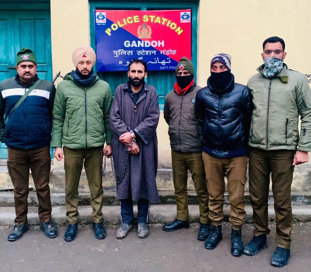 The police party of Police Station Gandoh, led by SHO Police Station Gandoh Insp. Vikram Singh, along with a police party of Jammu Police under the supervision of SSP Doda Abdul Qayoom and SDPO Gandoh Sahazada Kabir Matoo, nabbed a most wanted thief and absconder, namely Farooq Ahmed Rather @ Farooq Kala S/O Mohd Sharief Rather @ Sharief Kala R/O Thaloran Tehsil Gandoh District Doda.