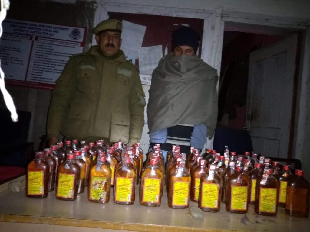 In the continuing war against drugs and illicit liquor, Doda Police said that during naka checking at Karara Police Post, one person, namely Pinku Bhagat S/O Chaman Lal R/O Drown Kerani (Bhella) Doda, was found carrying a bag in a suspecious condition. The said accused was immediately apprehended and, during his search, 60 bottles of Whisky, 250 ml each, a total of 15 litres of wine, were recovered from his possession. During questioning, the accusedwas found involved in illegally carrying and selling consignments of wine in general areas of Prem Nagar and Karara.