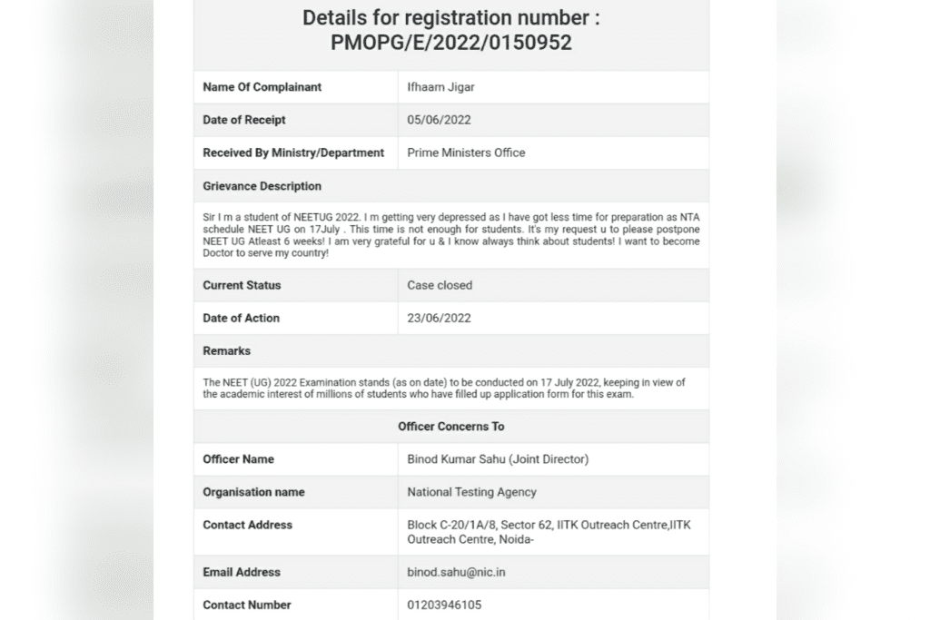 As you know, millions of NEET aspirants are demanding a postponement of NEET UG 2022, scheduled for July 17th. I am also an aspirant for NEET, so I personally submitted a grievance to PMO for the postponement of NEET UG on behalf of millions of students. In reply to this, Binod Kumar Sahu, Joint Director of NTA, responded and stated that the NEET UG EXAM STANDS (as on date) to be conducted on July 17, 2022. Keeping in view of the academic interest of millions of students who have filled up application forms for this exam.