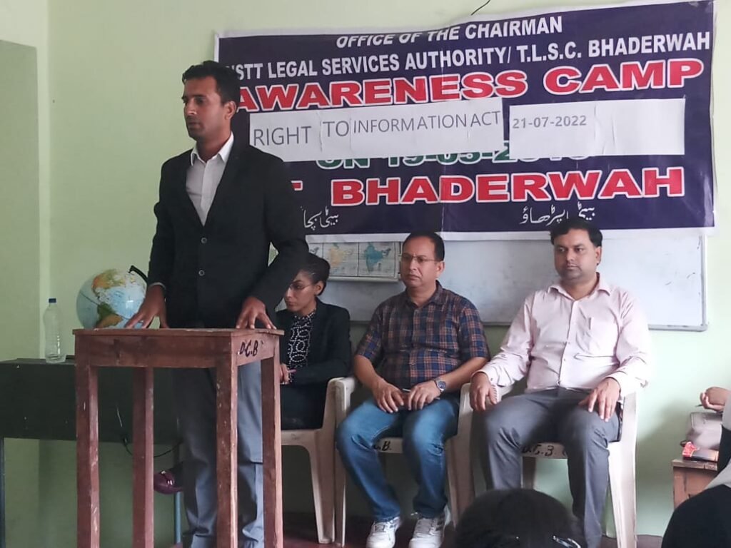 A one-day awareness programme on the “Right to Information Act 2005” was held here at Degree College Bhaderwah in collaboration with the District Legal Services Authority.The programme started with a welcome address by Dr. Kuldeep Kumar Sharma, principal of GDC Bhaderwah. Dr. Sandeep Kotwal, Convener, Debate and Seminar Committee, holds the proceedings of the programme. Dr. Sandeep Kotwal shared his views about the benefits of the Right to Information Act 2005, especially for students.