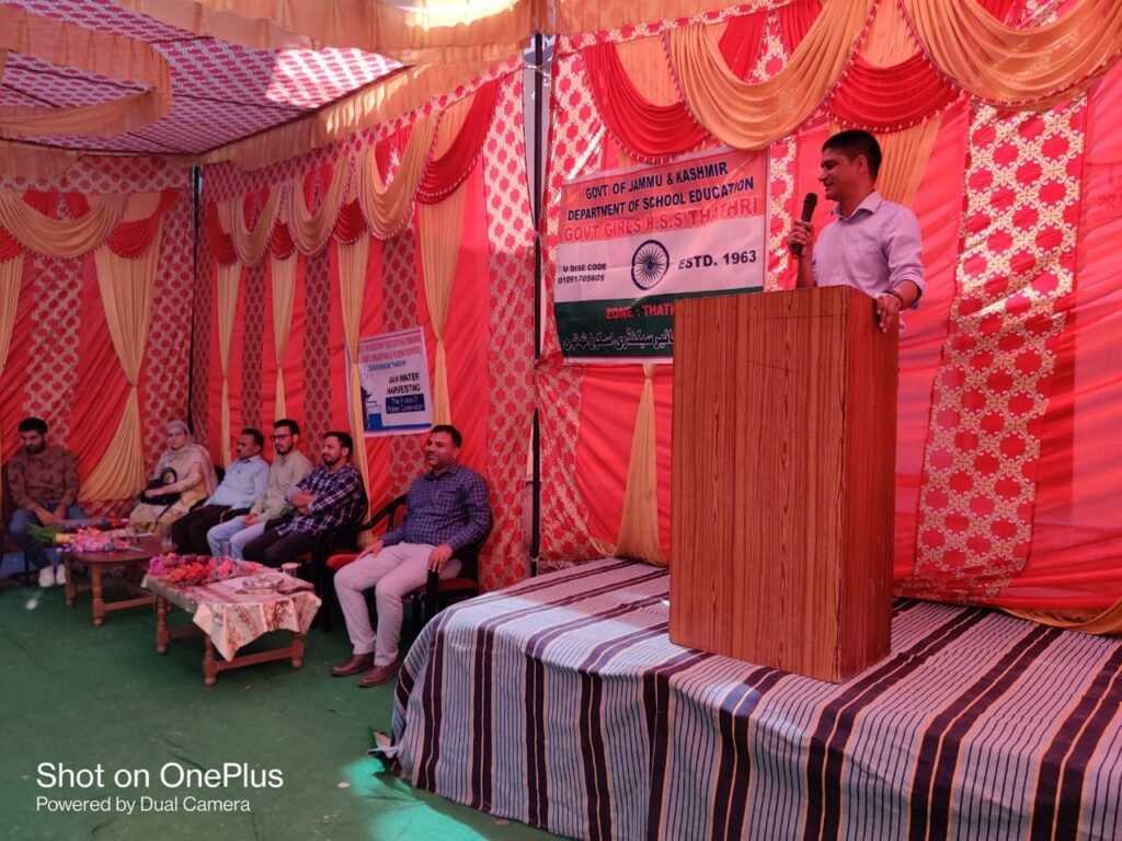Principal GGHSS Thathri B.D. Sharma gave a welcome address. On the topic “Catch the rain, wherever it falls, whenever it falls”, a total of four speakers, including Om Parkash BDO Thathri, Ashfaq Hussain (JKAS) Tehsildar Kahara, Mohd Saleem, Assistant Professor, Dr Bushra Wani, Technical Expert, Watershed District Doda, and also two students from Girls HS Sec School expressed their views. The staff of GHSS played an important role in the programme, where Mr. Amirjit Lecturer was stage secretary.
