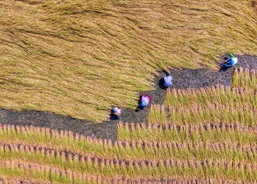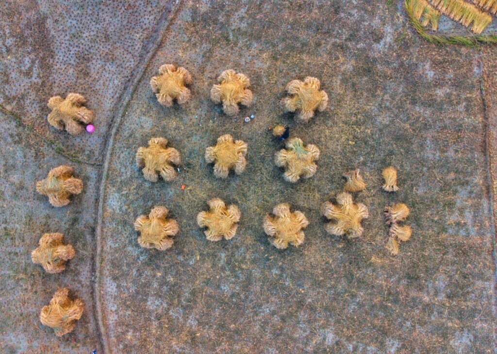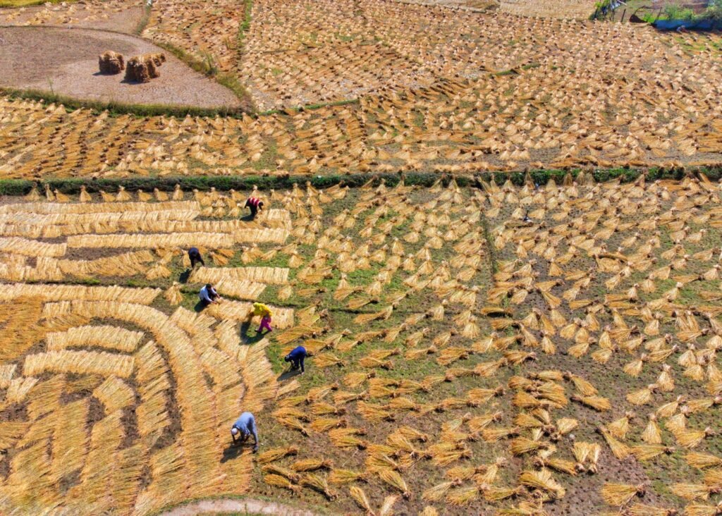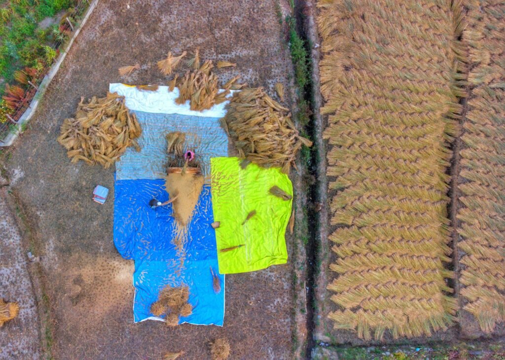 It is an occasion of joy for kids and of community cooperation and joint venture for adult villagers. A group of workers, including men, women, and children, harvest rice manually. Harvested rice is also transported manually to the thrashing floor, and the thrashing is done by beating the harvest over wooden logs followed by winnowing.