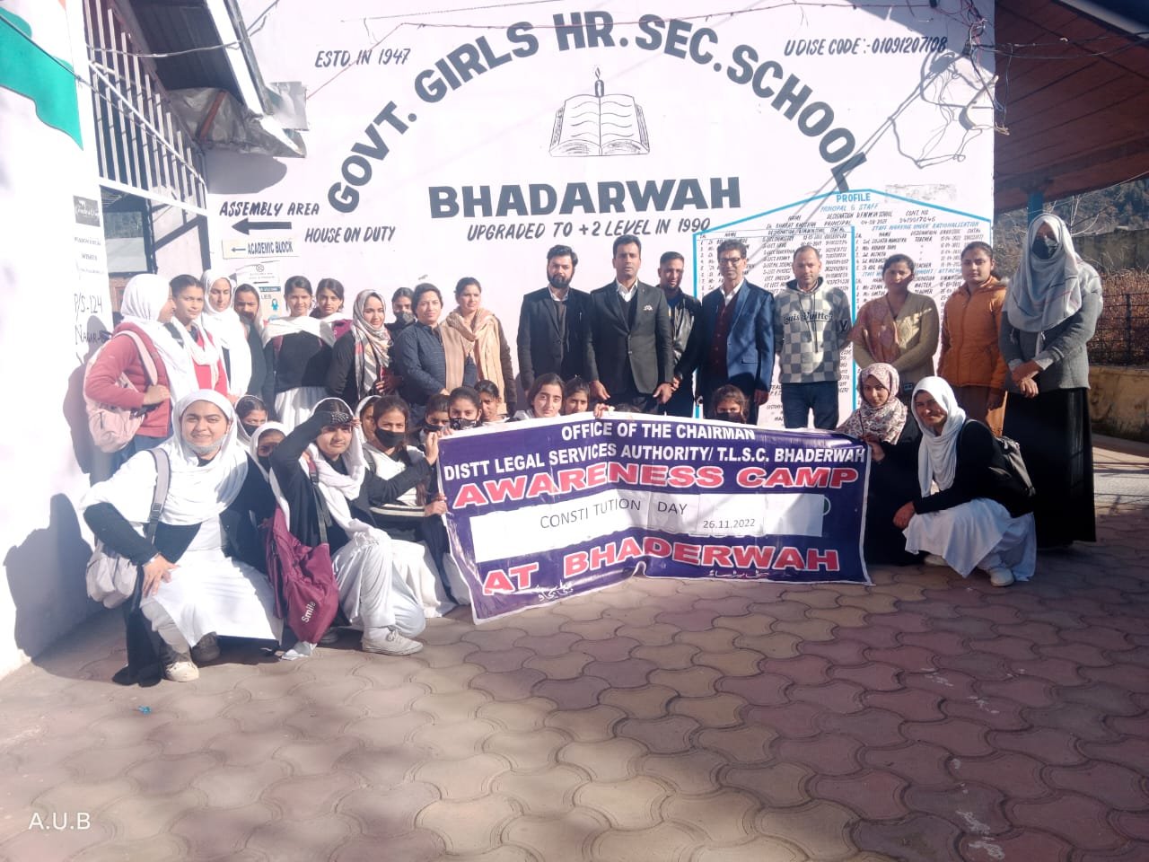 District Legal Services Authority (DLSA) Bhaderwah celebrated Constitution Day today on the premises of the Government Higher Secondary School for Girls in Bhaderwah, where the preamble to the constitution was also read. Bharat Bhushan, the principal of the school, served as the chief guest. Vice-principal Brijesh Kumar, lawyers Mohd Majid Malik and Devyia Kotwal, teacher Sujata Mangotra, PLV Omesh Chouhan, Afsha Shamim, and Reeta Devi were also present.