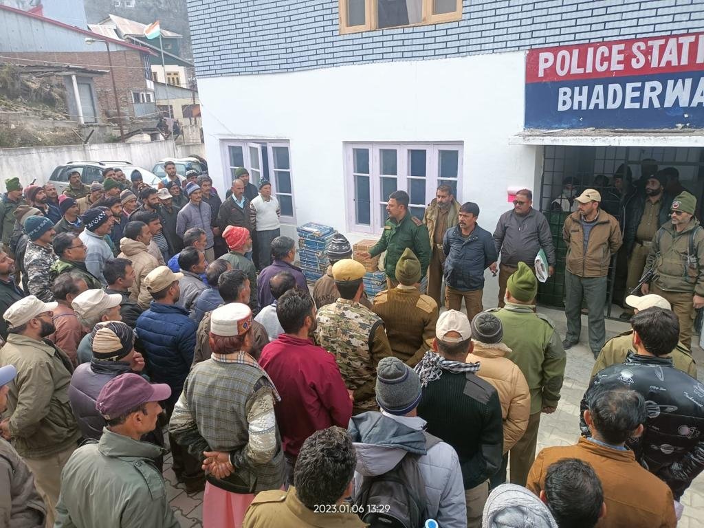 In order to ensure alertness among VDGs (earlier known as VDCs) for conducting area domination, patrolling, and effective surveillance in their respective areas, all VDGS heads (category V-1) of Bhaderwah area were called to Police Station Bhaderwah and were thoroughly briefed by Inspector Jatinder Singh, SHO PS Bhaderwah, about their charter of duties that they are supposed to do in their respective areas, including area domination, patrolling, and effective surveillance.