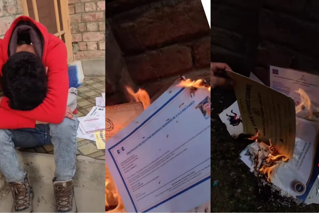 A viral video of a youth burning his original documents including degrees, certificates, and all achievement certificates has sparked outrage on social media. The video has gone viral with people assuming that he did something wrong, while some say that the certificates were fake or Xerox copies and he did it for views on his video. However, some argue that the Kashmiri youth is suffering from anxiety due to the political crisis in the region.