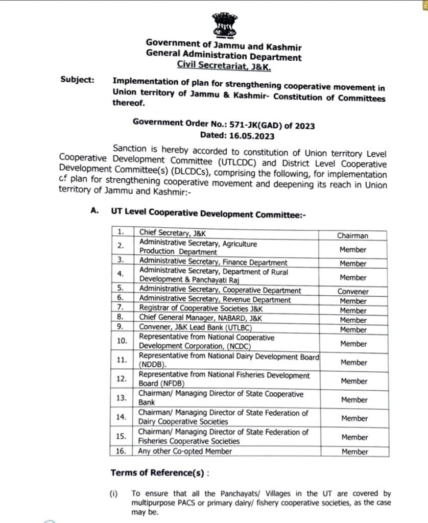 In a significant move to bolster the cooperative movement and enhance its outreach, the Government of Jammu and Kashmir has announced the implementation of a comprehensive plan. Under Government Order No.: 571-JK(GAD) of 2023, Union territory Level Cooperative Development Committee (UTLCDC) and District Level Cooperative Development Committee(s) (DLCDCs) will be constituted to drive the execution of this visionary strategy.