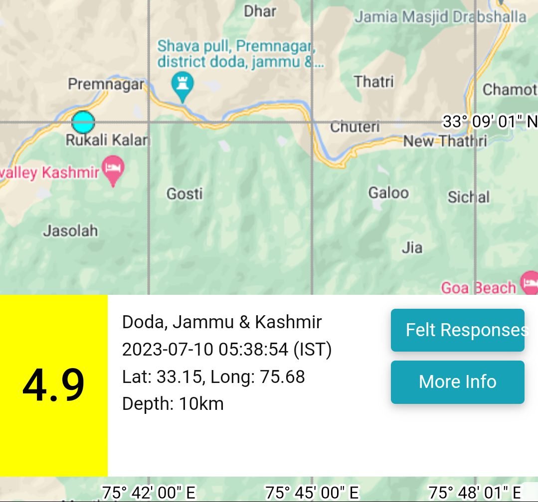 In the early hours of the morning, a 4.9 magnitude earthquake shook the Chenab Valley, causing panic and distress among the residents, as per correspondents of The Chenab Times. The earthquake, with its epicenter located at Latitude 33.15 and Longitude 75.68 in Doda’s Premnagar Thathri area, was reported by the National Centre for Seismology.