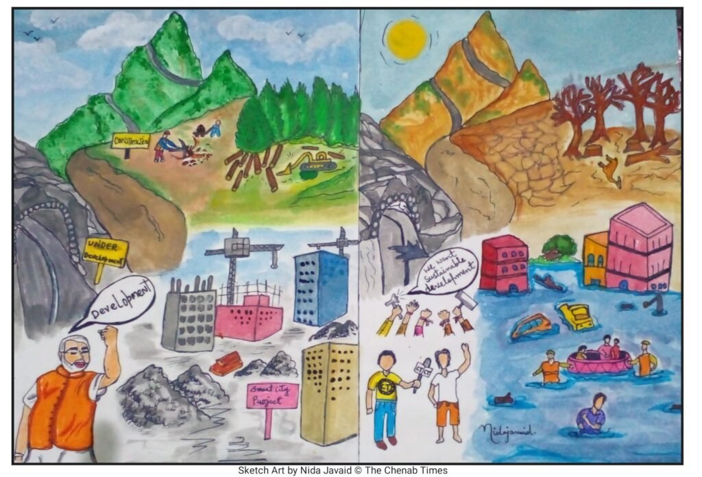The thought-provoking sketch by Nida Javaid in The Chenab Times serves as a powerful reminder that unchecked development can have dire consequences for our environment and communities. It highlights the pressing need for sustainable development, where progress is achieved while safeguarding the planet’s natural resources and fostering social equity. By embracing sustainable practices and making conscious choices, we can forge a path towards a future where development and disaster no longer stand in stark contrast but instead harmonize for the betterment of our planet and humanity.