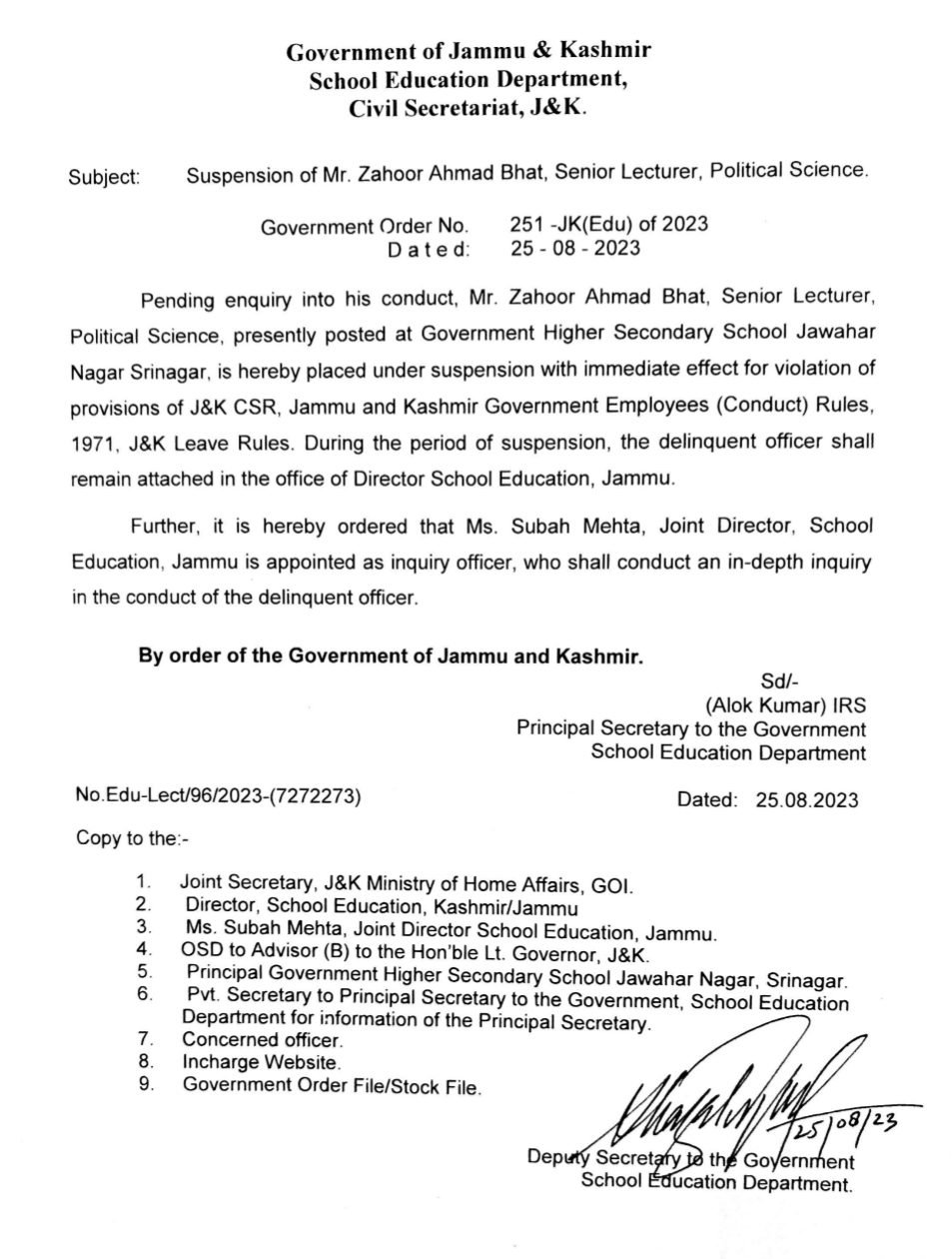 The School Education Department’s decision to suspend Bhat with immediate effect was based on alleged violations of provisions within the Jammu & Kashmir Civil Service Regulations, Jammu & Kashmir Government Employees Conduct Rules, and J&K Leave Rules. The suspension order stipulates that Bhat will remain attached to the office of the Director School Education Jammu during this period.