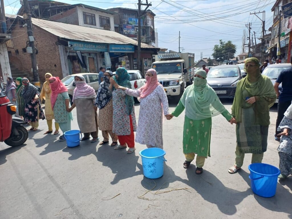 In a display of frustration and desperation, residents of Rainawari in Srinagar took to the streets on Saturday, blocking the main road near JLNM Hospital to voice their grievances over a severe water shortage that has persisted for a month. The protest, primarily led by women, brought traffic to a standstill as they called upon the Jal Shakti department to address their dire situation.