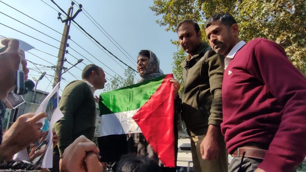 During the demonstration, the protesters voiced strong objections to Israel’s actions, with Mehbooba Mufti prominently carrying the Palestinian flag.