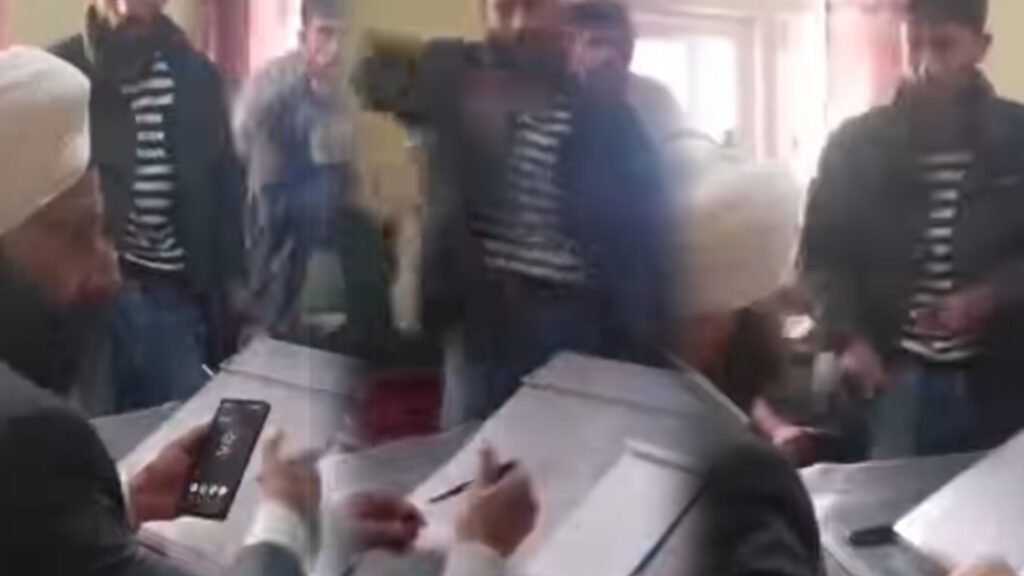 A meeting of staff members at Block Changa turned violent on Sunday afternoon when a group of around 25-30 individuals allegedly led by Lamberdar Amarsinghpura, Mushtaq Ahmed, barged into the meeting room and began leveling accusations against the Panchayat Secretary, Satwant Singh.