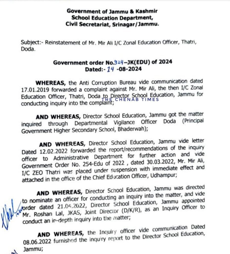 The Jammu and Kashmir administration has reinstated Mir Ali, the former In-Charge Zonal Education Officer (ZEO) Thathri, Doda, more than two years after he was suspended, a day before his retirement. The decision to reinstate him comes after a detailed inquiry revealed that the complaint against him was baseless, with the original complainant even denying having lodged it.