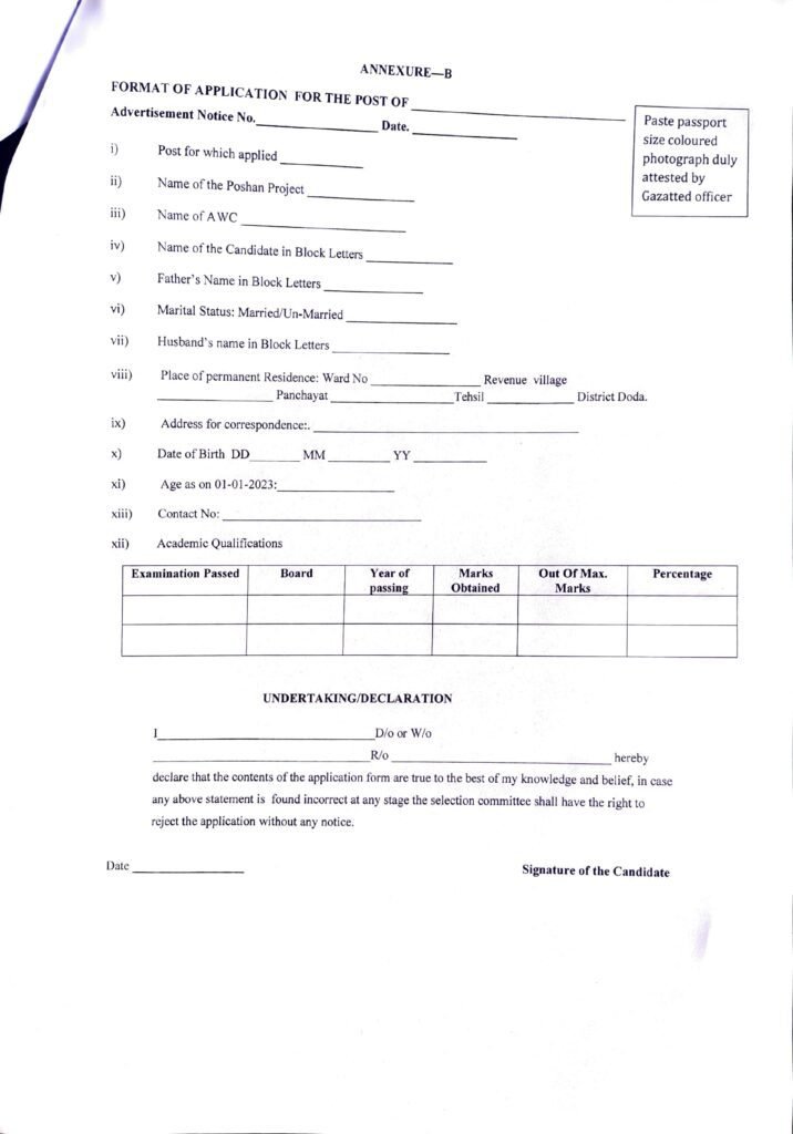 Candidates must submit their applications in the prescribed format (Annexure-B) within 14 days from the publication date of this notice (i.e 21 December 2024). Applications can be sent by registered post or delivered in person to the CDPO office, POSHAN Project Doda.