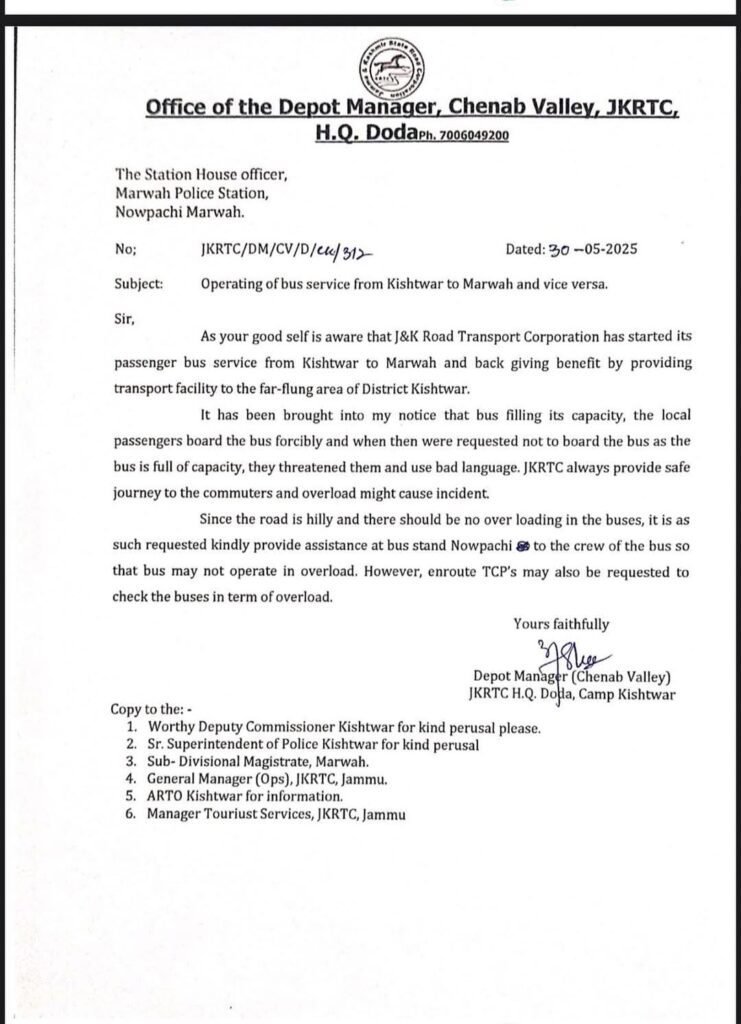 However, the letter, dated May 30, 2025, and addressed to the Station House Officer of Marwah Police Station in Nowpachi Marwah, paints a concerning picture. Signed by the Depot Manager (Chenab Valley), JKRTC H.Q. Doda, the letter notes that while the bus service has been a boon for commuters, instances of overloading have led to unsafe conditions. It states that passengers have been boarding buses beyond their capacity, often resorting to threats and abusive language towards the crew when denied entry. “The road is hilly, and there should be no overloading in the buses,” the letter emphasizes, requesting police assistance at the Nowpachi bus stand to ensure compliance with safety norms. It also calls for Traffic Control Police (TCP) personnel to conduct checks en route to prevent overcrowding, which could lead to accidents.