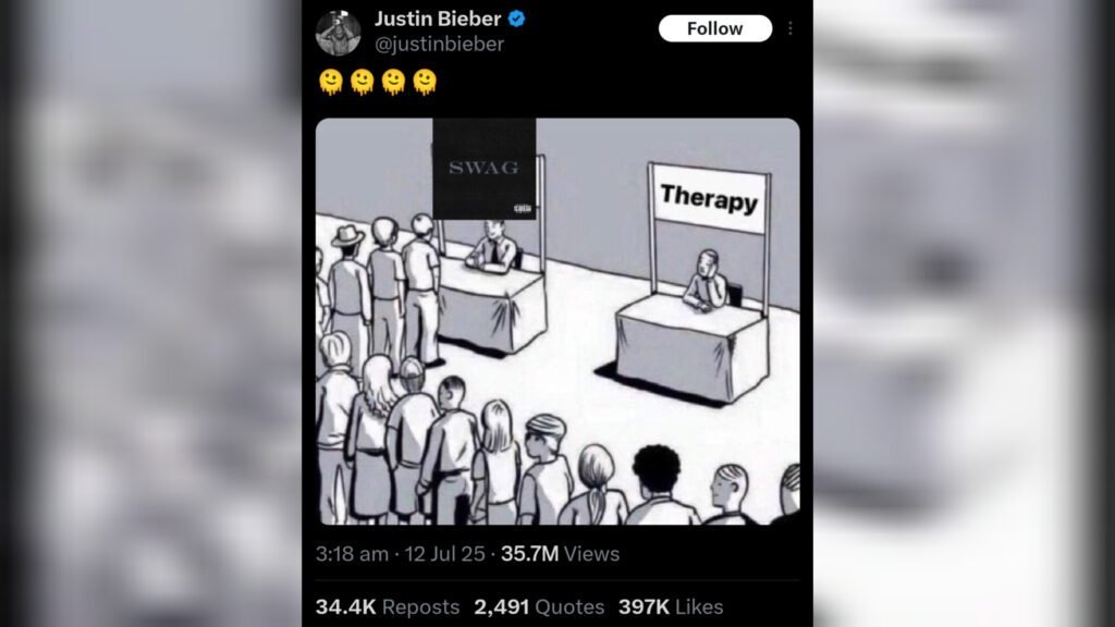 12 July — In a striking blend of pop culture and social commentary, global music icon Justin Bieber has ignited online conversations with a meme shared on X late Friday, coinciding with the release of his latest album, Swag. Posted at 21:48 CDT on July 11, 2025, the image depicts a crowded booth labeled “SWAG” juxtaposed against a deserted “Therapy” counter, prompting reflections on the role of music as a modern antidote to mental health challenges.