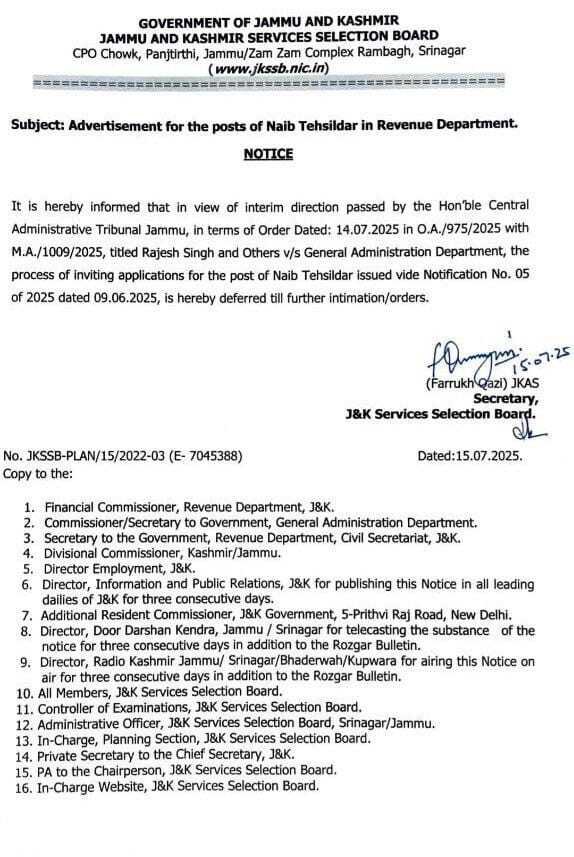“In view of the interim direction passed by the Hon’ble Central Administrative Tribunal, Jammu… the process of inviting applications for the post of Naib Tehsildar… is hereby deferred till further intimation/orders,” the notification reads.