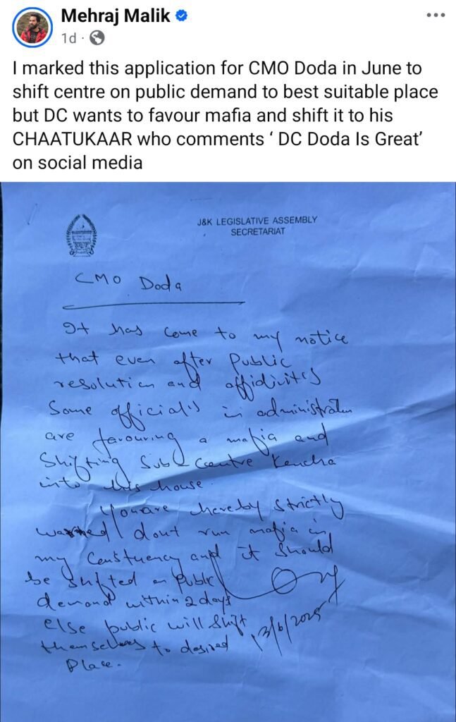 Doda, September 7 — A political and administrative dispute over the relocation of the Ayushman Arogya Mandir/Health and Wellness Centre (AAM/HWC) at Kencha village in Thathri block has intensified, with MLA Mehraj Malik accusing the district administration of favouring vested interests, while officials allege illegal interference and obstruction in the functioning of the centre.