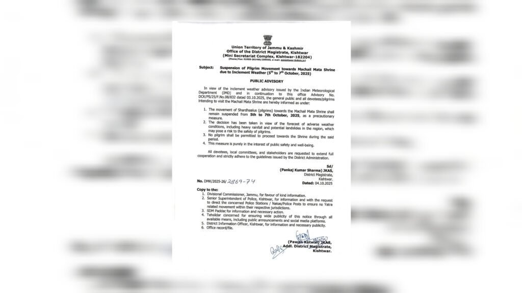 The order, issued by District Magistrate Pankaj Kumar Sharma under advisory No. DCK/PS/25/F.No.08/332 dated October 3, 2025, invokes the IMD’s alert for heavy rainfall and potential landslides in the region, which could pose significant risks to the safety of pilgrims and Shardhalus (devotees). “The movement of Shardhalus (pilgrims) towards the Machail Mata Shrine shall remain suspended from 5th to 7th October, 2025, as a precautionary measure,” the advisory states, emphasising that no pilgrim shall be permitted to proceed towards the shrine during this period.