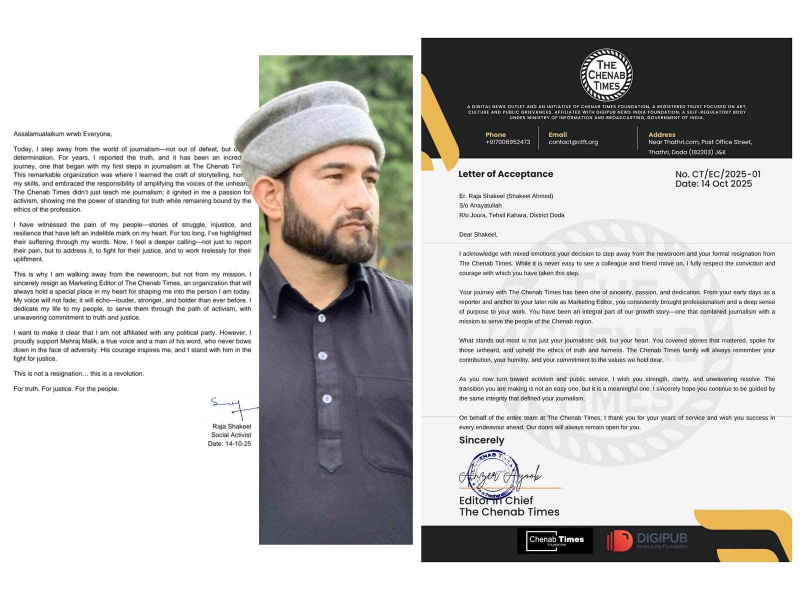 Thathri, October 14 — In a heartfelt move marking the end of one chapter and the beginning of another, Er. Raja Shakeel, a prominent journalist and Marketing Editor at The Chenab Times, has formally resigned from his position to dedicate himself to activism and public service.