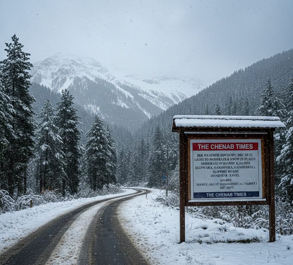 The Jammu Kashmir Union Territory Disaster Management Authority has issued an advisory forecasting light to moderate rain and snow at most places in Jammu division and Kashmir plains on December 20 and 21. Moderate to heavy snow is likely at higher reaches of Kupwara, Bandipora and Ganderbal districts, potentially causing slippery roads and traffic disruptions.