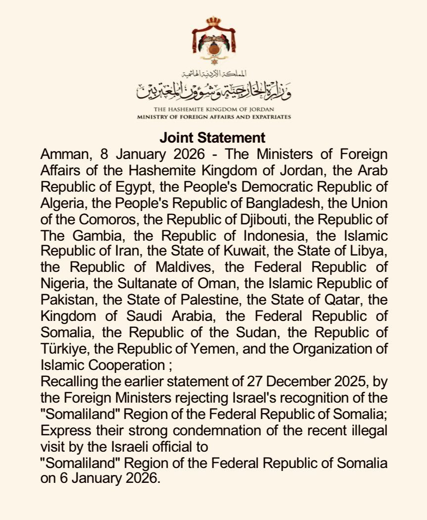 The Chenab Times has learned that foreign ministers from more than 20 countries, including Jordan, Egypt, Algeria, Bangladesh, Comoros, Djibouti, Gambia, Indonesia, Iran, Kuwait, Libya, Maldives, Nigeria, Oman, Pakistan, Palestine, Qatar, Saudi Arabia, Somalia, Sudan, Türkiye, and Yemen, along with the Organization of Islamic Cooperation, have issued a joint statement strongly condemning an Israeli official’s visit to the Somaliland region on January 6, 2026.