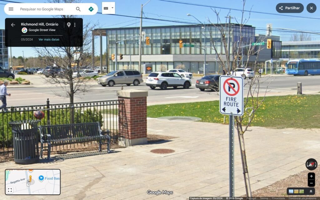 The background building, signage, fencing, and surrounding objects were matched using Google Maps and Street View. The location was confirmed as a parking area near the Oak Ridges Public Library in Richmond Hill, Ontario, Canada.